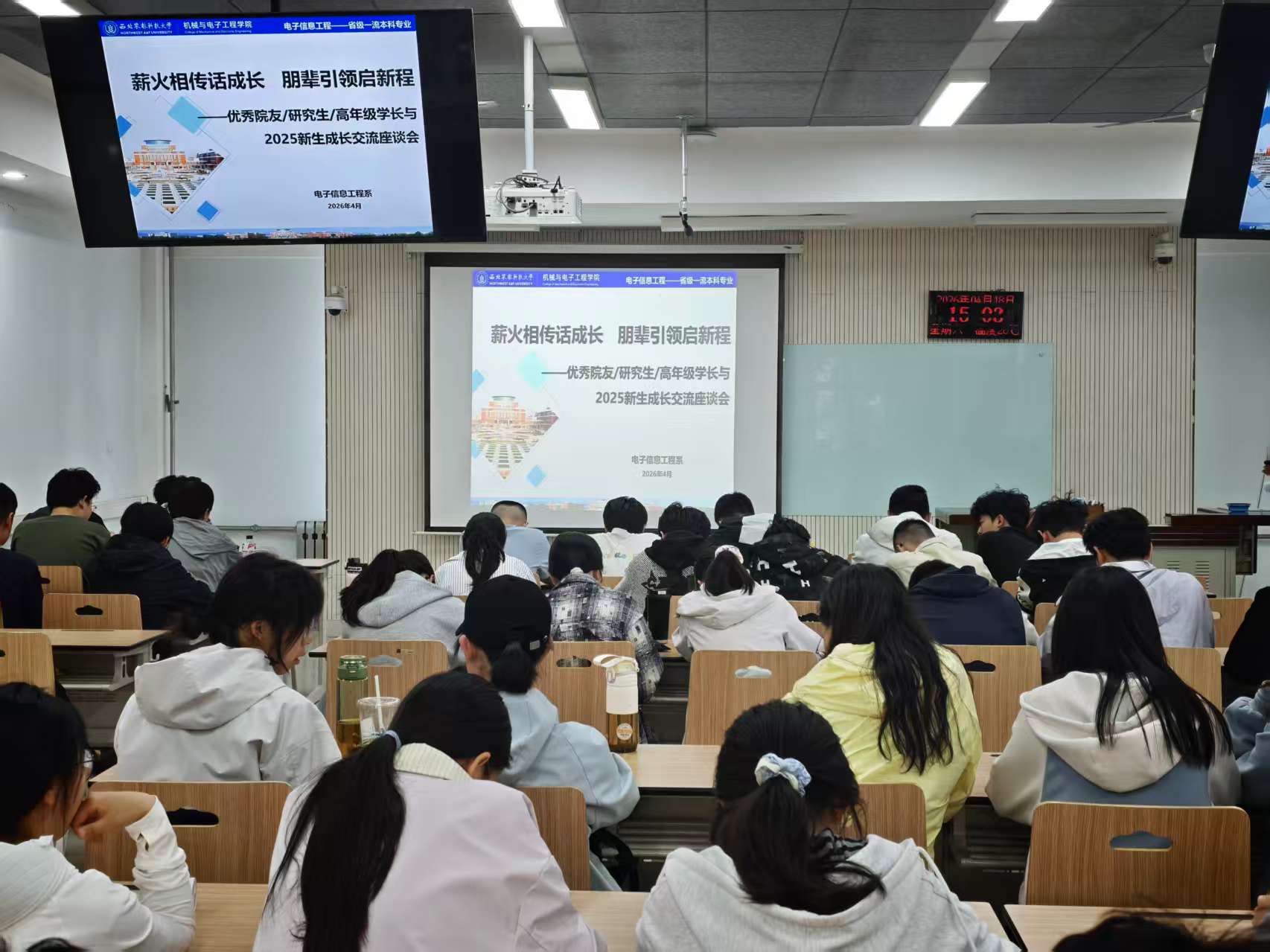 为热烈响应学院80周年院庆工作安排,深化党支部间联学共建,充分发挥优秀党员、校友及高年级学生的朋辈引领作用,4月18日下午,研究生第二党支部与电信教工党支部联合举办“薪火相传话成长,朋辈引领启新程”主题组织生活会。5位校友、3位研究生代表及6位高年级学长与60余名2025级新生面对面交流,分享成长经验。本次活动邀请已毕业优秀院友代表4人、研究生支部成员代表3人、高年级保研考研及就业学长代表6人,活动由余克强副教授主持,党支部书记龙燕与宋怀波同志到会指导。