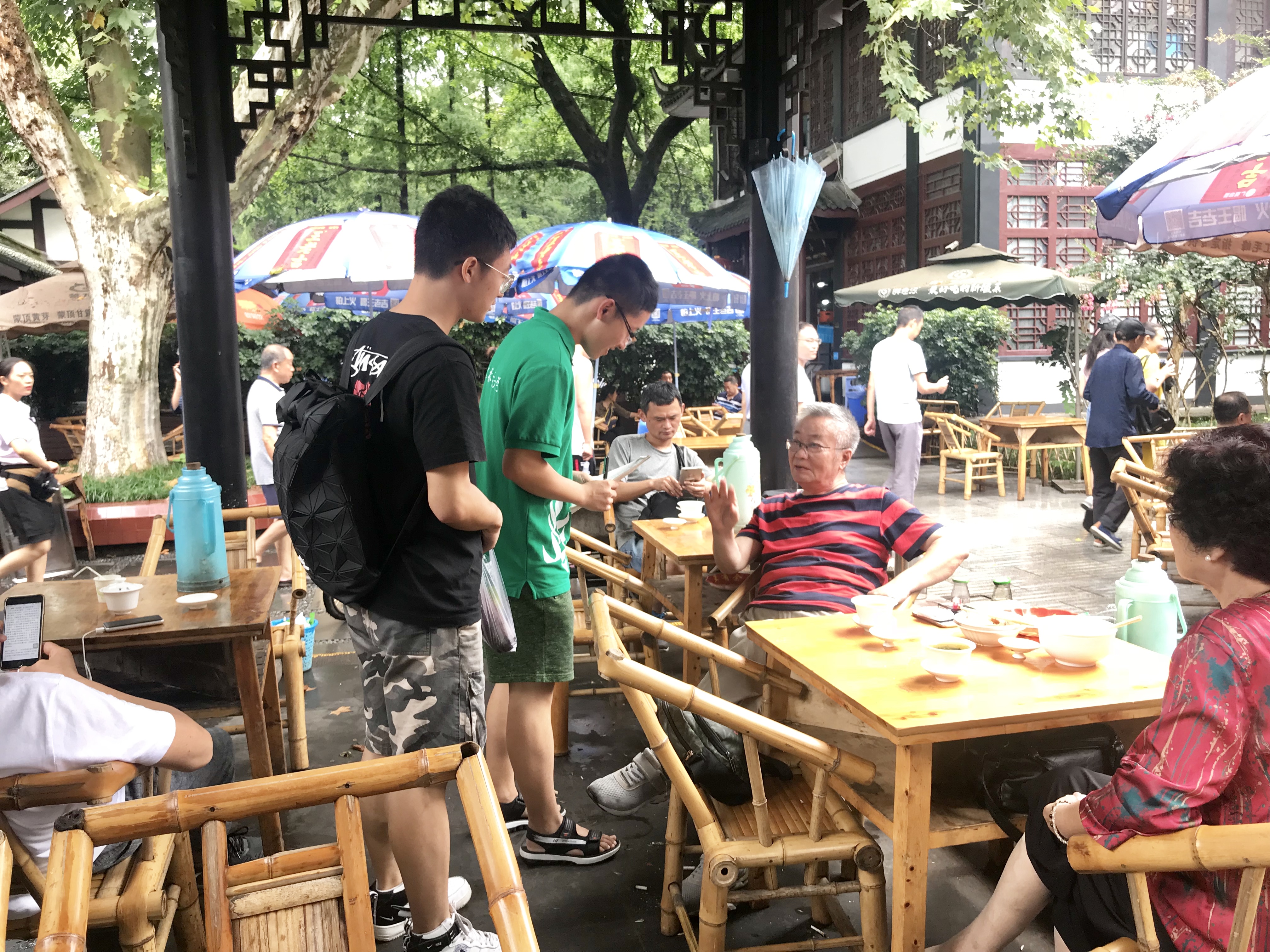 本次调研,队员们深刻感受到成都独特茶文化的魅力之处。成都人喜欢休闲娱乐,茶馆除了提供茶,茶馆内卖报的、擦鞋的、修脚的、按摩的、掏耳朵的、卖瓜子豆腐脑的,穿梭往来,服务性的项目花样之多,也算成都茶馆一景。成都人喜欢“摆龙门阵”,经常喊一杯茶,和同桌的茶友坐一下午,聊一下午,邻里之间,家长里短,乡间旧闻,国内外大事等,只要一聊起来,不等天黑不会停。茶馆里除了喝茶娱乐,还有经典的技艺表演—“茶博士”。所谓“茶博士”,是在茶馆里煎茶、煮茶、沏茶、泡茶的师傅。很多茶博士倒茶时就像在耍杂技一样,提壶从一尺多高处倾注下一股清流往碗里汨汨冲茶,不溅分毫,很是厉害。不过队员们今天去体验的时候未能有幸见到此场景。