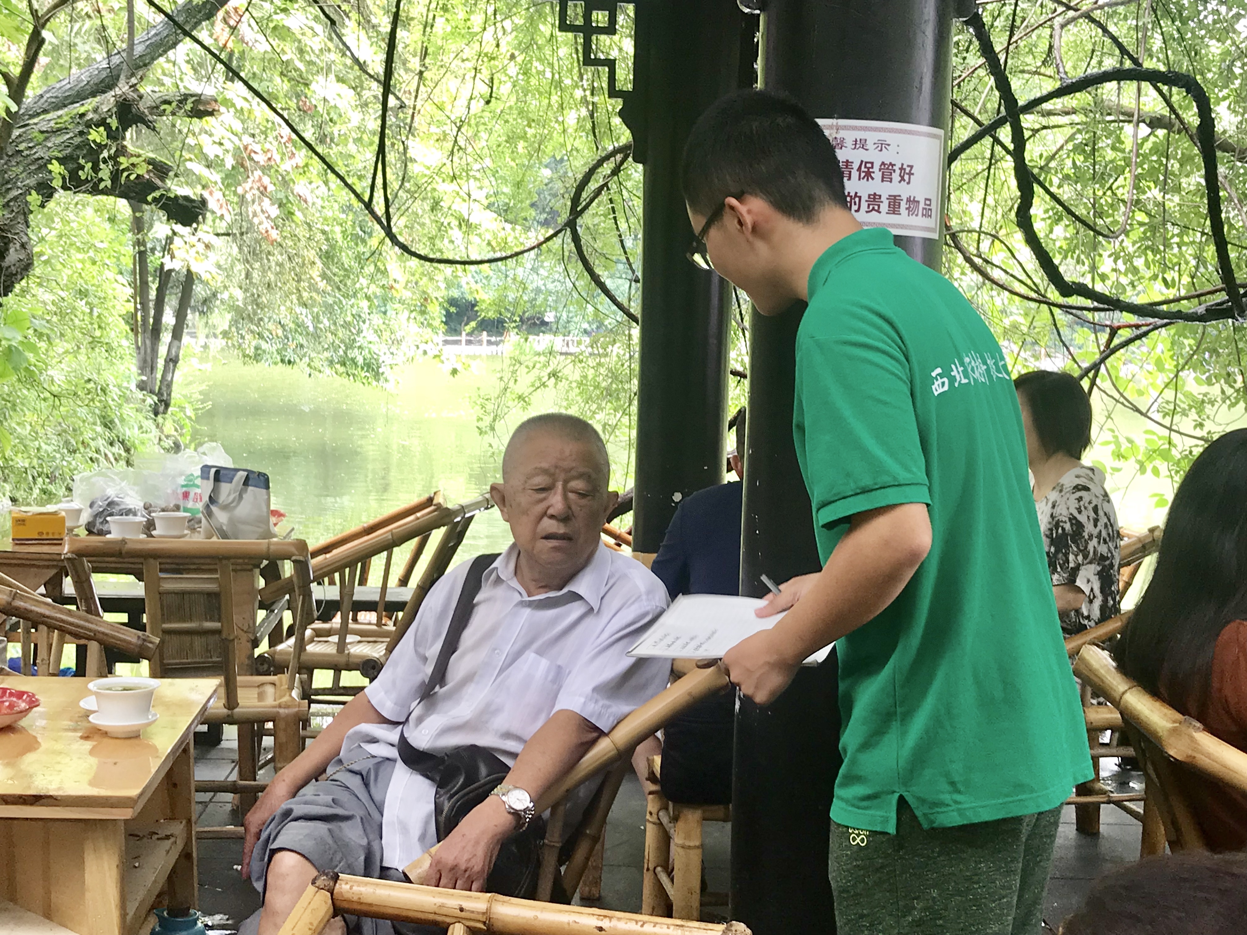 随后队员们去采访了喝茶的几位茶客,有位年纪比较大的老爷爷是茶馆的常客,每天中午吃完饭就溜达出来到茶馆呆一下午,他告诉队员们这个茶是队员们中国的传统文化,外国是没有的,这是门艺术,需要好好地保存以及流传。在队员们采访的人里还有一位是外地人,在他看来,茶馆是一个非常放松娱乐的地方,让人感到十分的舒适惬意,还夸了夸成都是个好地方,成都人生活过得很惬意,娱乐至上。