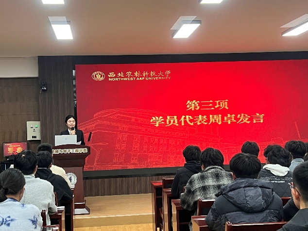 接着,学员代表周卓上台发言。她代表全体学员表达了对参加本次“青马工程”培训的荣幸与期待。周卓在发言中提到,青年是国家的未来、民族的希望,新时代赋予青年新的使命,马克思主义真理之光始终是青年成长路上的指路明灯。她号召全体学员以此次培训为契机,珍惜来之不易的学习机会,主动加强理论学习,深入领会马克思主义中国化时代化的最新成果,坚定理想信念,补足精神之钙。