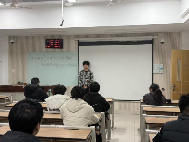为深入学习宣传贯彻党的二十届四中全会精神,引导班级同学深刻领会全会核心要义,将个人理想融入国家发展大局,机电学院学生会以“深学全会精神 勇担青春使命”为主题,开展政治理论学习活动。本次活动由学生会主席团成员主持,全体同学参与。活动伊始,主持人结合权威资料,向同学们简要介绍了党的二十届四中全会的召开背景与重大意义。她指出,全会于2025年10月20日至23日在北京举行,是我国即将胜利完成“十四五”主要目标任务、进入基本实现社会主义现代化夯实基础、全面发力关键时期召开的一次重要会议,审议通过的《中共中央关于制定国民经济和社会发展第十五个五年规划的建议》,为未来五年发展擘画了宏伟蓝图。随后,大家共同观看了中共中央新闻发布会关于全会精神解读的节选视频,直观感受全会精神的丰富内涵与实践要求。