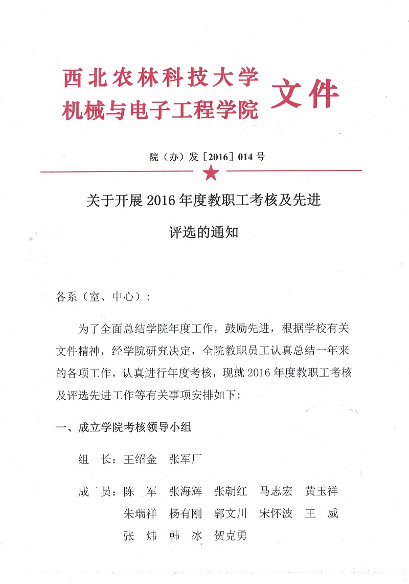 院(办)发[2016]014号关于开展2016年度教职工考核及先进评选的通知